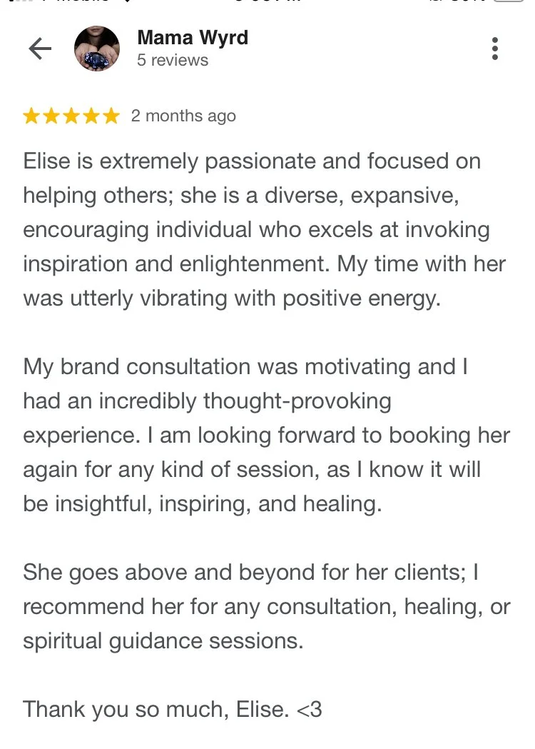 “Elise was a brilliant business coach. She inspired me to take a deeper look at the themes in my business and infuse her intuitive sense into my message. She is a pro when it comes to social media and definitely recommend her to help your business outreach!